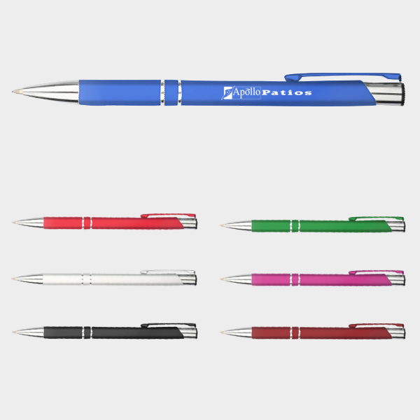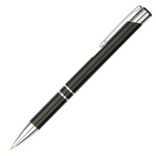 Executive-style retractable metal pen with engraved logo for longevity. Black ink and shiny chrome trim.