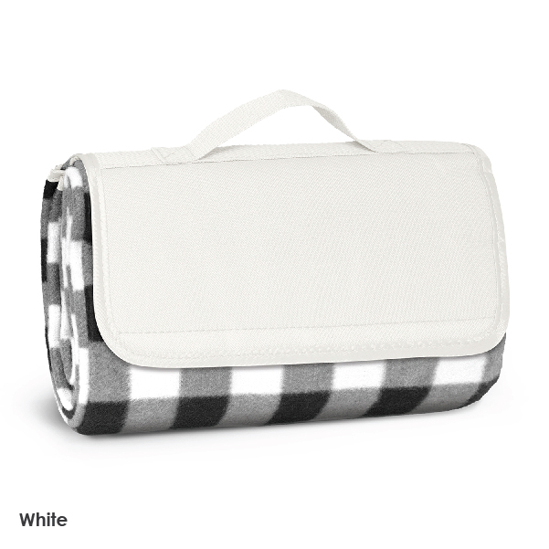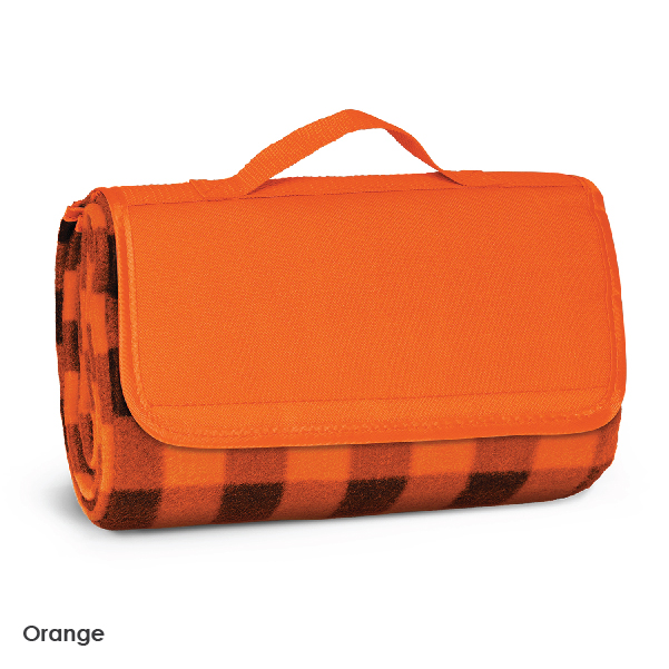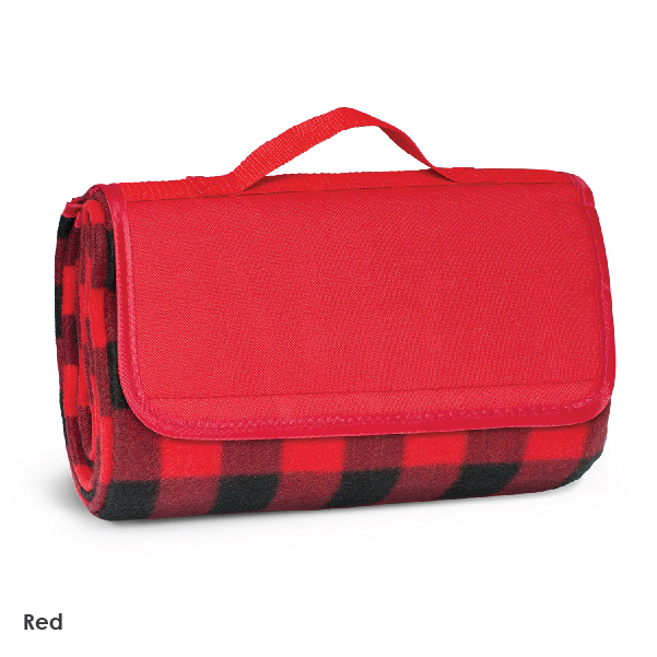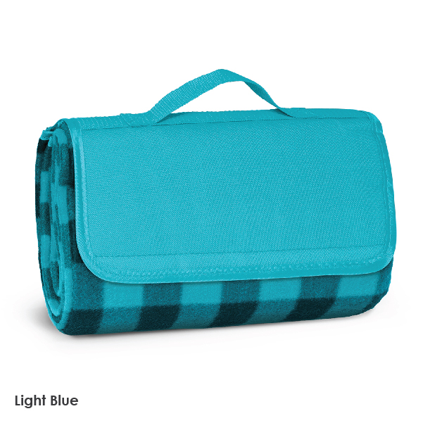 Custom printed woven fleece picnic blanket with a waterproof PE backing. It folds up after use with a velcro closure and handy carry handle.