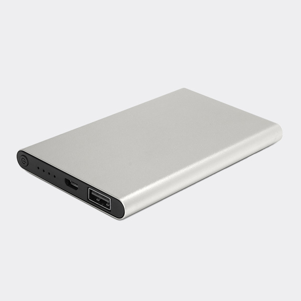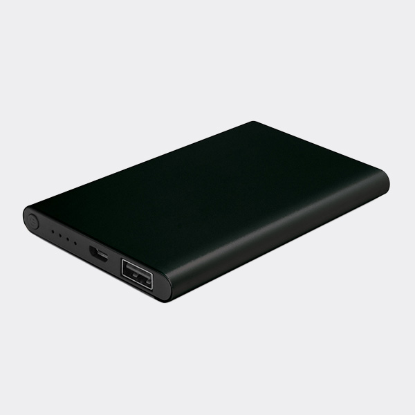 Thin 4000mAh power bank with a power gauge. The input power is 5V/1 Amp and the output power is 5V/1 Amp. It can be recharged in 5-6 hours.