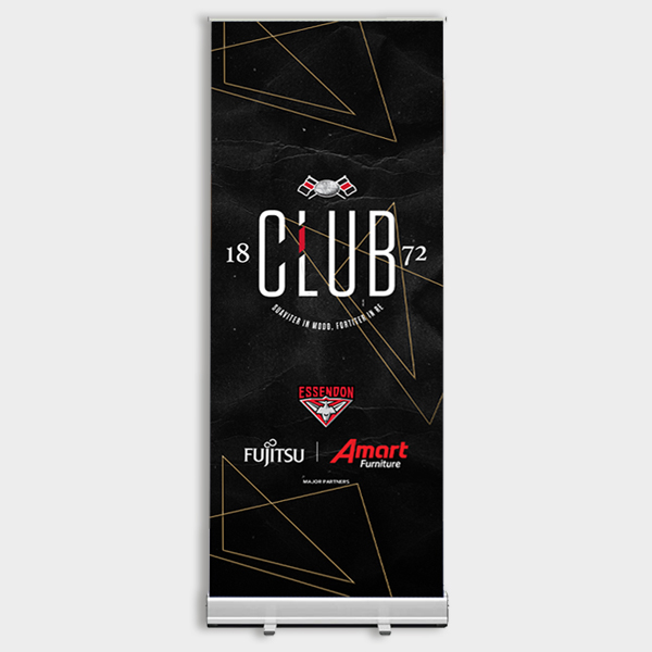 Full colour premium printed PVC banner in a silver metal Base with carry bag, sized: 850mm W x 2200mm H.